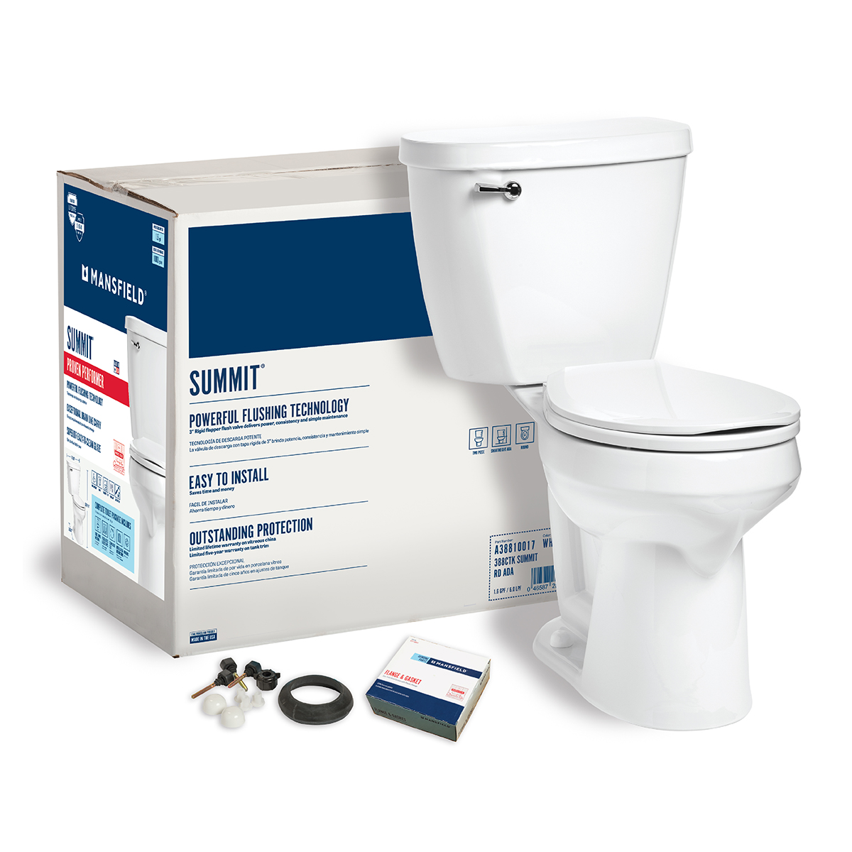 - Complete Toilet Kit (CTK) includes everything you need: toilet bowl and tank, toilet seat, flange bolts, wax ring with polyethylene flange and instructions